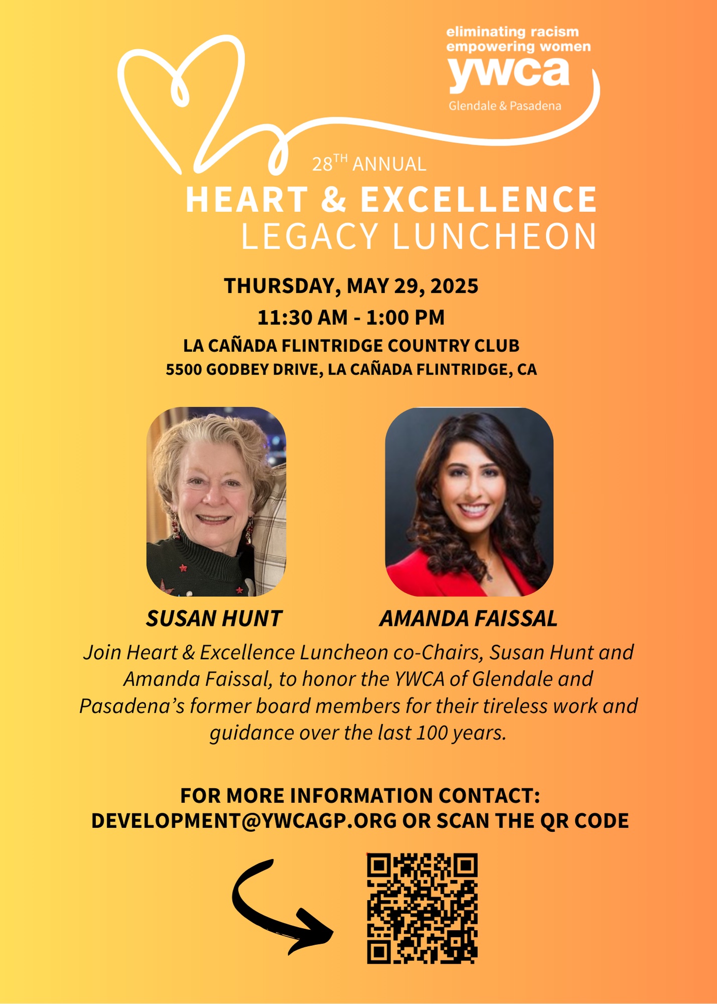 Susan Hunt and Amanda Faissal invite you to join them at the 28th Annual Heart & Excellence Legacy Luncheon on May 29th at the La Cañada Flintridge Country Club.