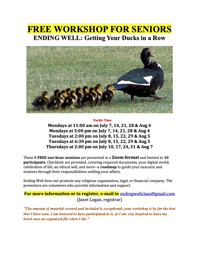 These 5 FREE one-hour sessions are presented in a Zoom format and limited to 10 participants. Checklists are provided, covering required documents, your digital world, celebration of life, an ethical will, and more--a roadmap to guide your executor and trustees through their responsibilities settling your affairs.