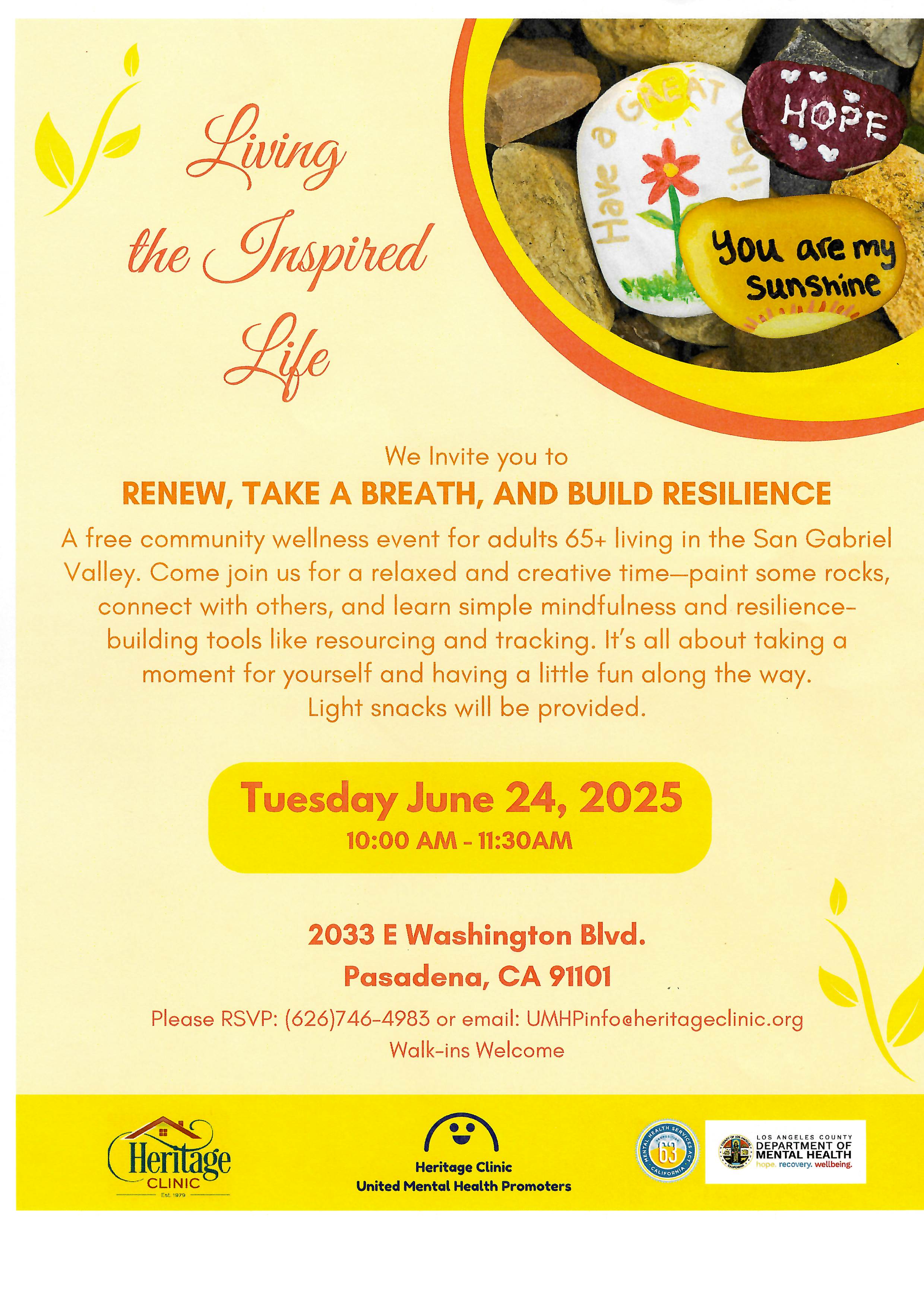 A free community wellness event for adults 65+ living in the San Gabriel Valley. Come join us for a relaxed and creative time-paint some rocks, connect with others, and learn simple mindfulness and resilience building tools like resourcing and tracking. It's all about taking a moment for yourself and having a little fun along the way. Light snacks will be provided.