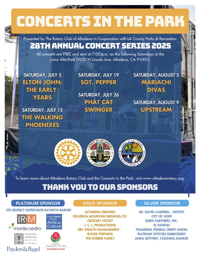 Join the Altadena Rotary in cooperation with LA County Parks & Recreation for the 28th Annual Concert Series. All concerts are free and start at 7pm at Loma Alta Park, 3330 N. Lincoln Ave., Altadena.