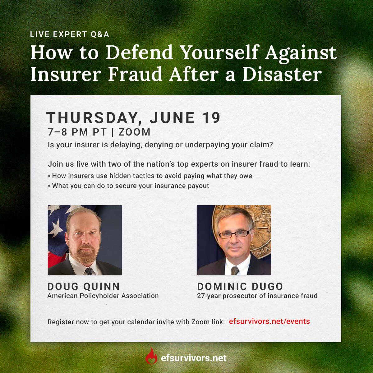 Join us live with two of the nation’s top experts on insurer fraud, who will show us how insurers use hidden tactics to avoid paying what they owe — and what you can do to secure the insurance payout your family needs to recover and rebuild.