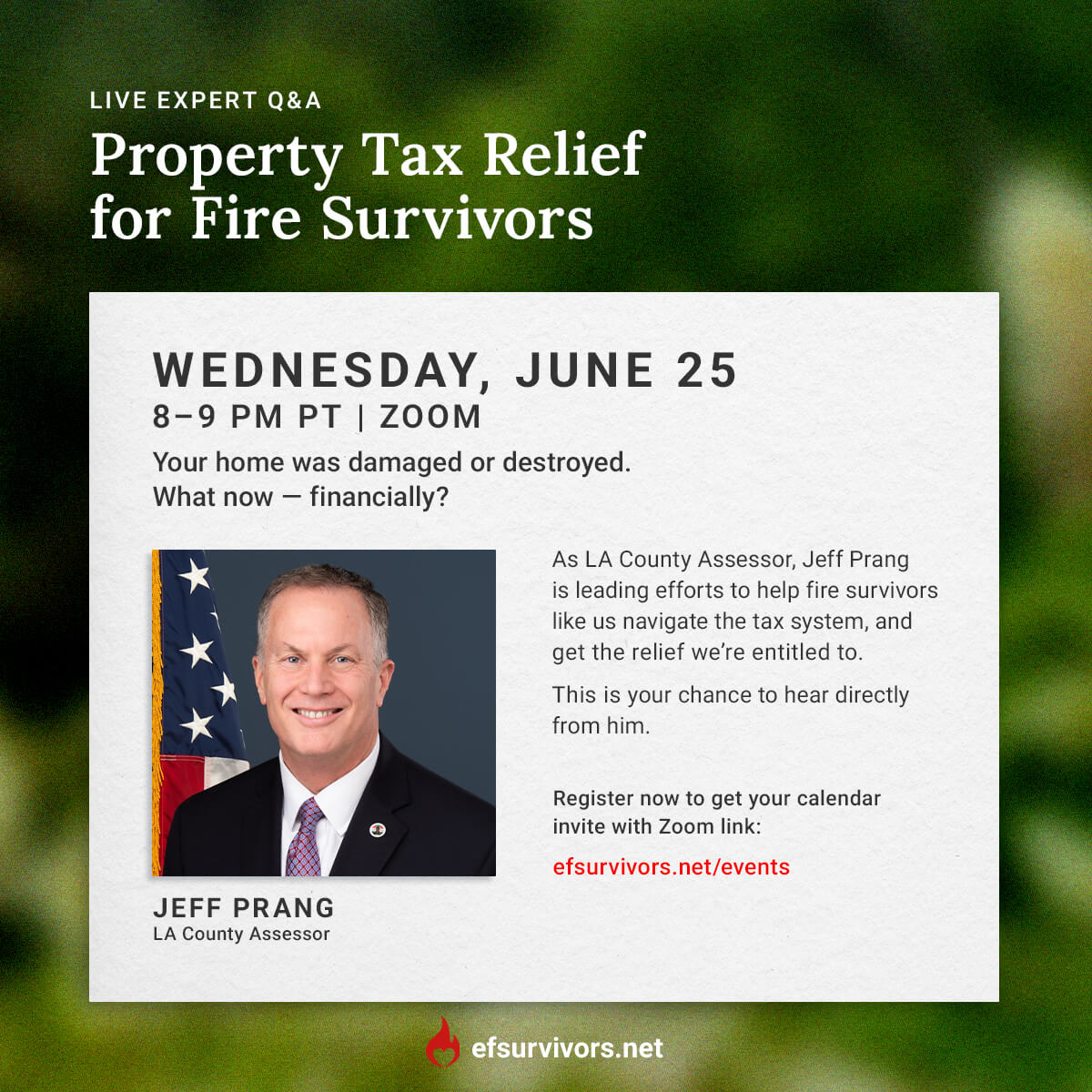 Your home was damaged or destroyed. What now — financially? As LA County Assessor, Jeff Prang is leading efforts to help fire survivors like us navigate the tax system, and get the relief we’re entitled to. This is your chance to hear directly from him. All are welcome — invite survivor friends and networks.