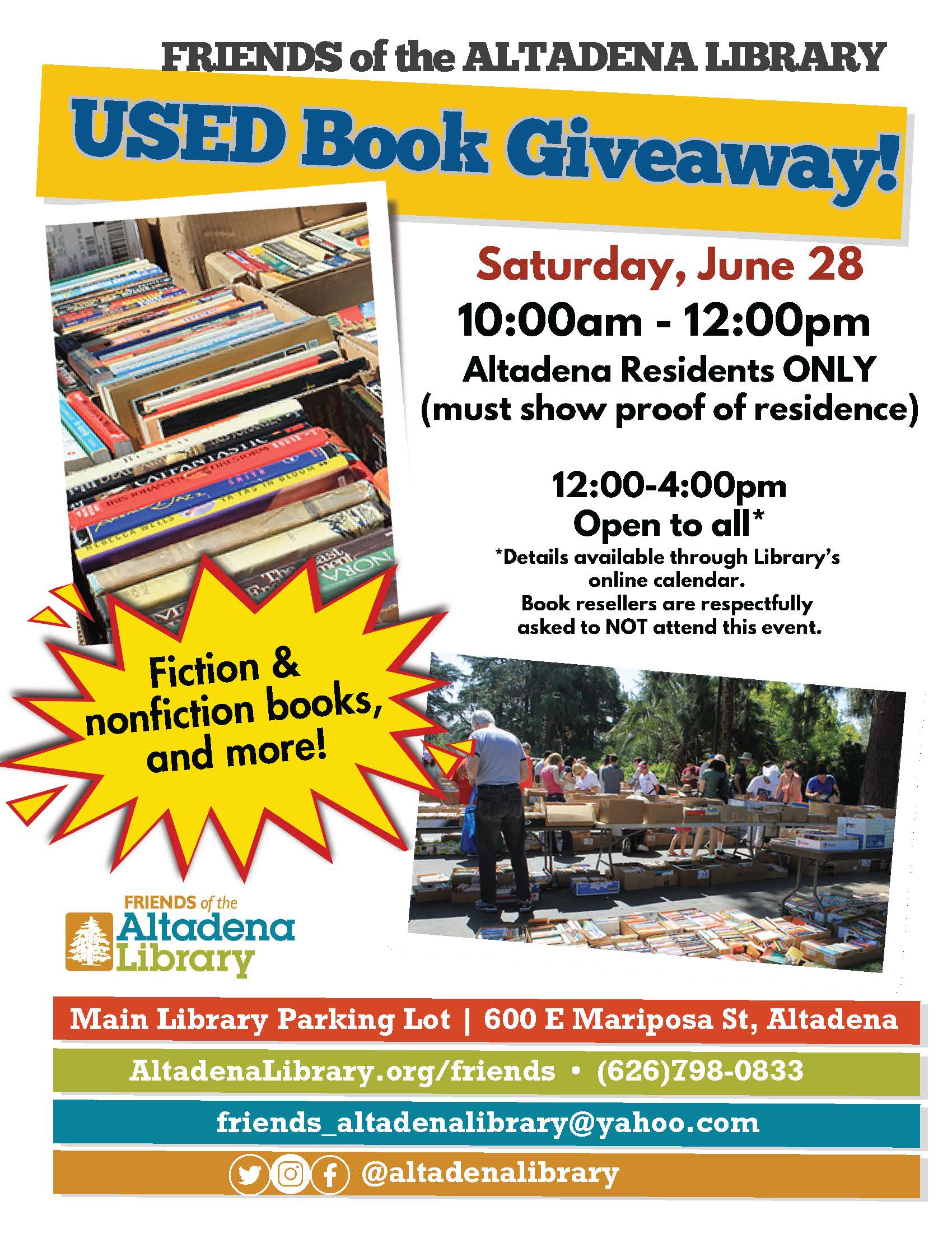 This giveaway is open ONLY to Altadena residents (must show identification) from 10am-12pm. During that time Eaton Fire survivors can choose up to 75 books for FREE to help replace books that were burned or discarded due to smoke damage.