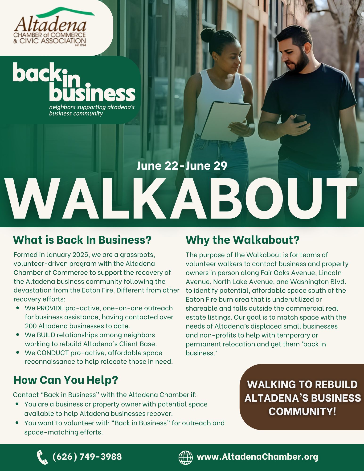 The Altadena Chamber of Commerce is pleased to announce that Back in Business, its volunteer-powered initiative, has launched a second phase of its successful outreach effort with a Walkabout from June 22nd to June 29th along Pasadena’s northern commercial corridors. The weeklong event is central to the program aimed at helping Altadena businesses recover after the Eaton Fire through needs assessment and space reconnaissance for relocation.