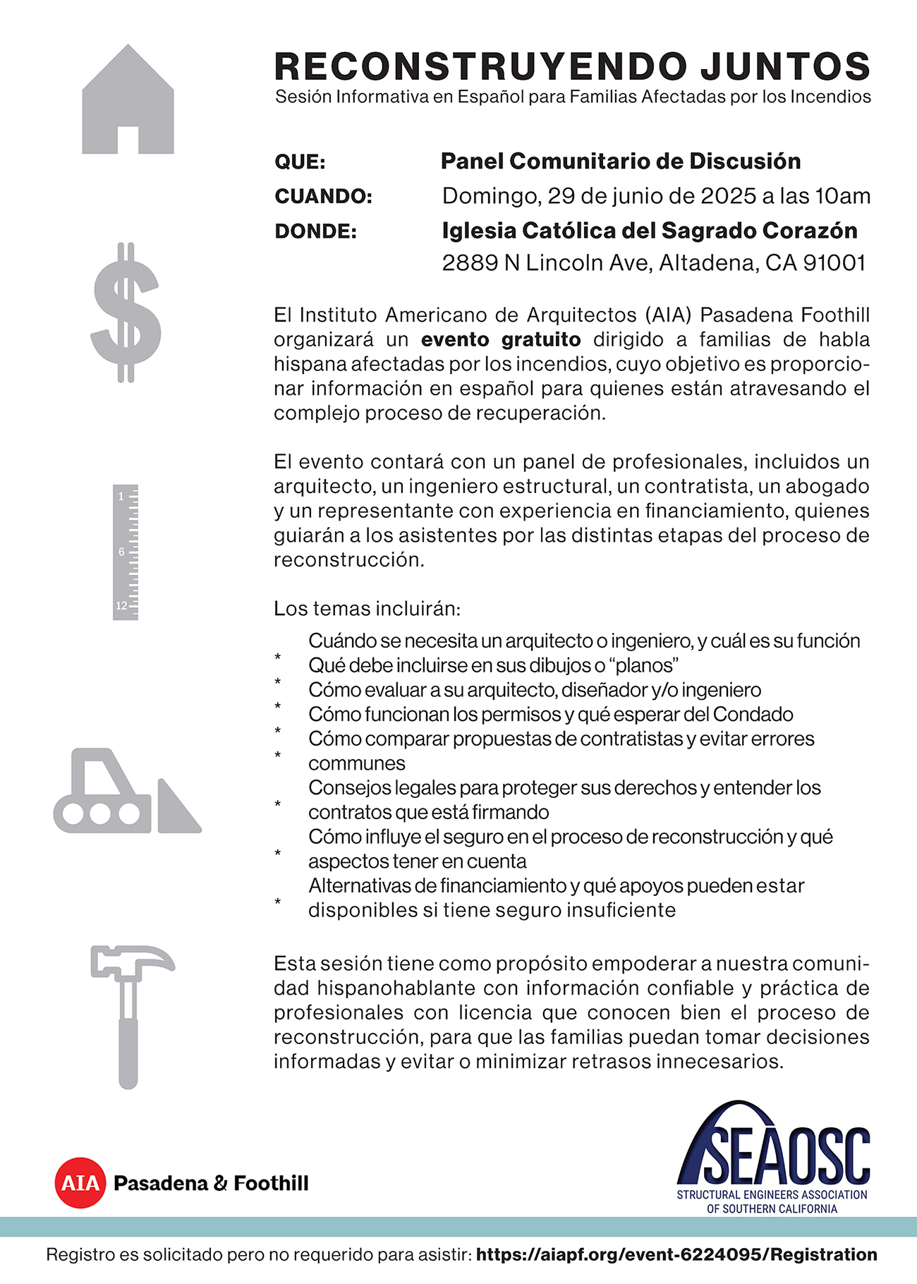 El Instituto Americano de Arquitectos (AIA) Pasadena Foothill organizará un evento gratuito dirigido a familias de habla hispana afectadas por los incendios, cuyo objetivo es proporcionar información en español para quienes están atravesando el complejo proceso de recuperación.