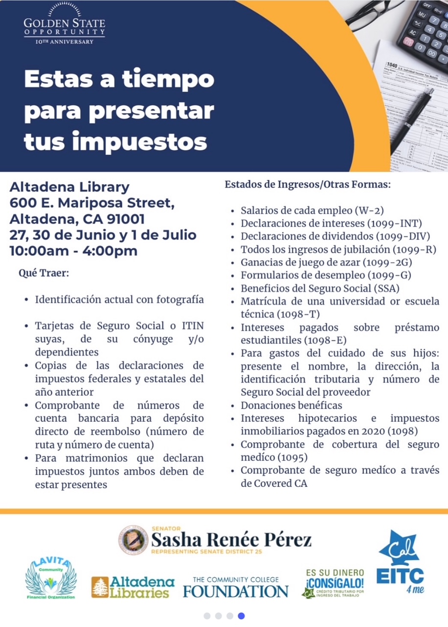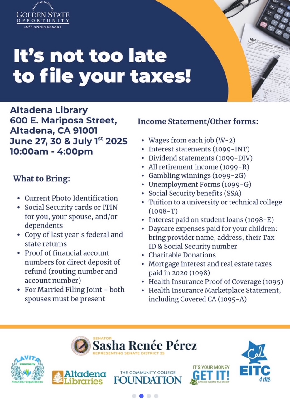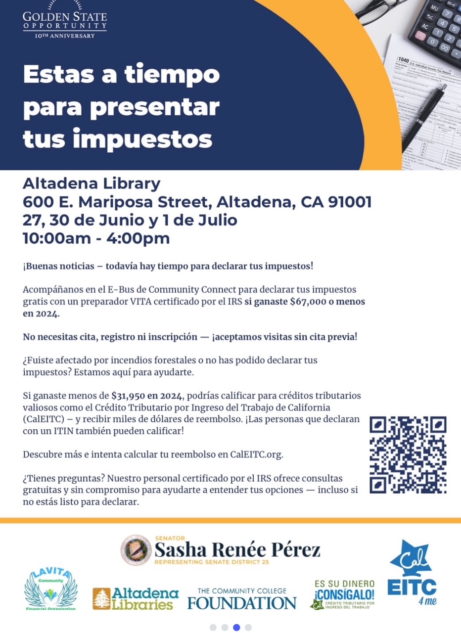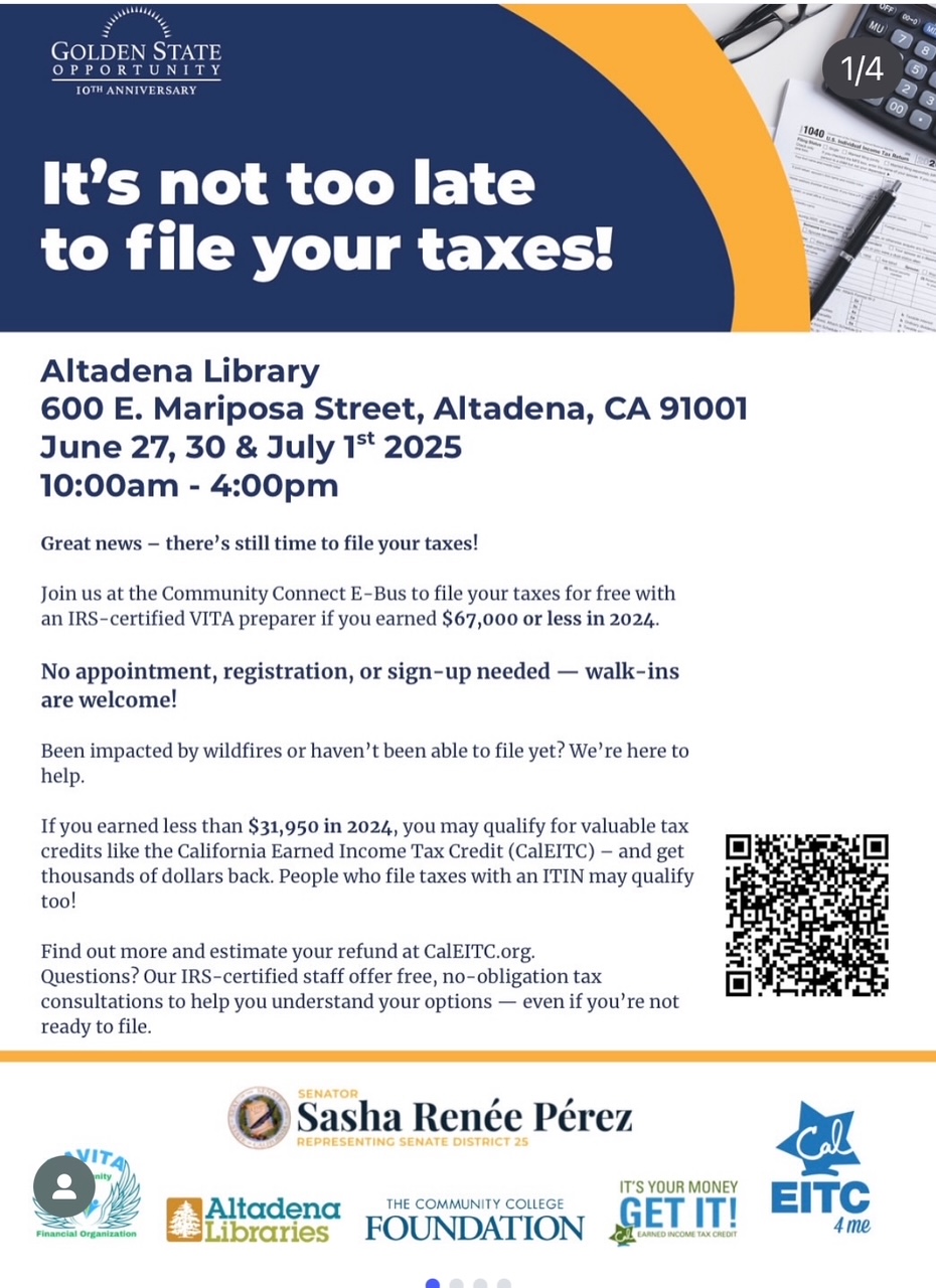 June 27, 30 & July 1 • 10 AM-4 PM Community Connect E-Bus at the Altadena Library, 600 E. Mariposa Street