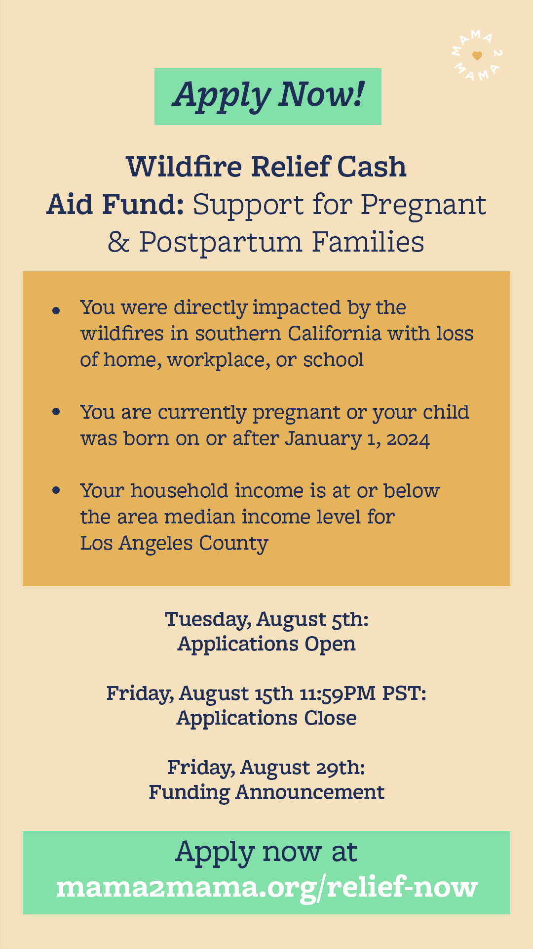 The Mama2Mama Wildfire Relief Fund: Support for Pregnant & Postpartum Families is providing cash aid for pregnant and postpartum families directly impacted by the fires. If you were a recipient of round 1 and round 2 funding, you may be eligible for round 3 funding. Please see income requirements and application process details below.
