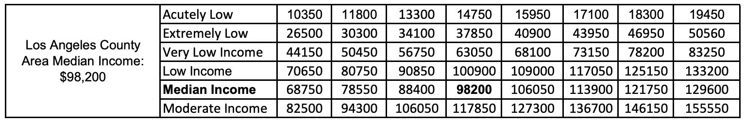 - Their household income is at or below the area median income level for Los Angeles County. Review the income guidelines here