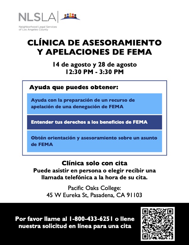 For Eaton Fire residents, NHS team members will be on site at the Altadena Main Library (600 E. Mariposa) Tuesdays and Thursdays from 10am-6pm to assist residents who want help with their application for the state mortgage program that provides grants up to $20,000 (3 months of mortgage payments) for disaster survivors. WALK-INS are welcome.