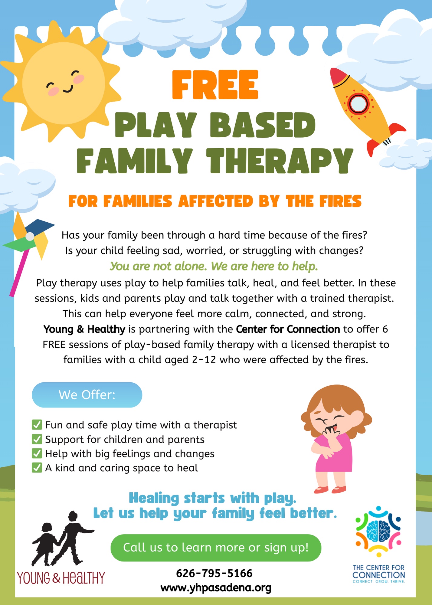 Play therapy uses play to help families talk, heal, and feel better. In these sessions, kids and parents play and talk together with a trained therapist. This can help everyone feel more calm, connected, and strong. Young & Healthy is partnering with the Center for Connection to offer 6 FREE sessions of play-based family therapy with a licensed therapist to families with a child aged 2-12 who were affected by the fires.