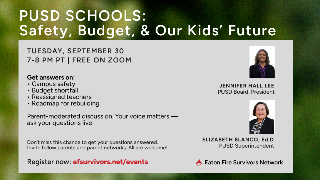 Featuring Jennifer Hall Lee, President, PUSD Board. Get answers on: campus safety, the budget shortfall, staff from closed schools, the roadmap for rebuilding. Parent-moderated discussion. Your voice matters — ask your questions live. Invite your parent friends and networks. All welcome!
