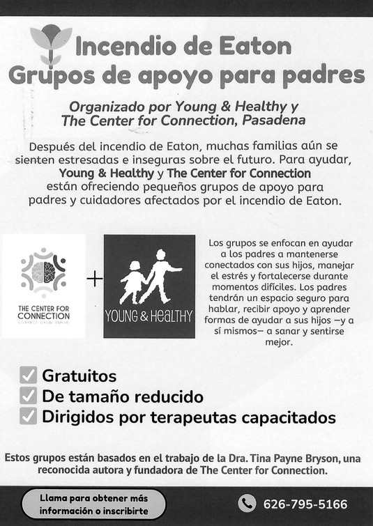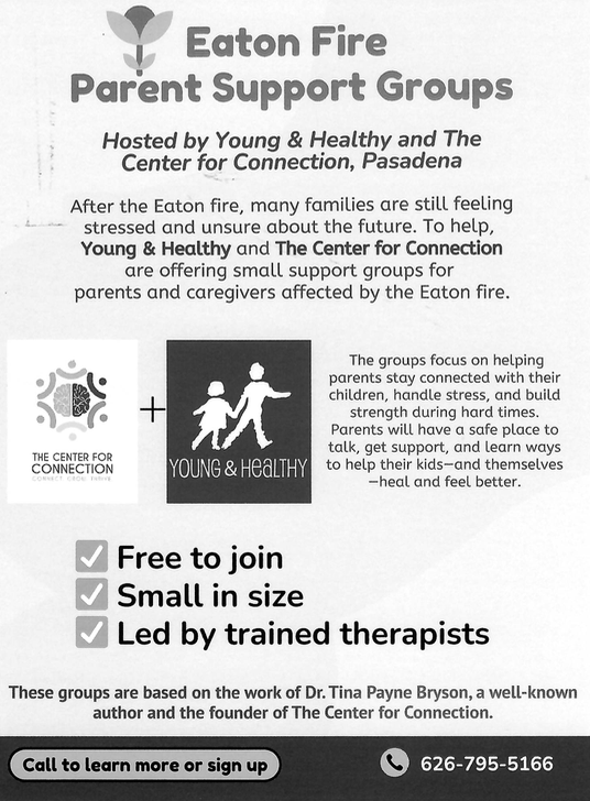 After the Eaton fire, many families are still feeling stressed and unsure about the future. To help, Young & Healthy and The Center for Connection are offering small support groups for parents and caregivers affected by the Eaton fire.