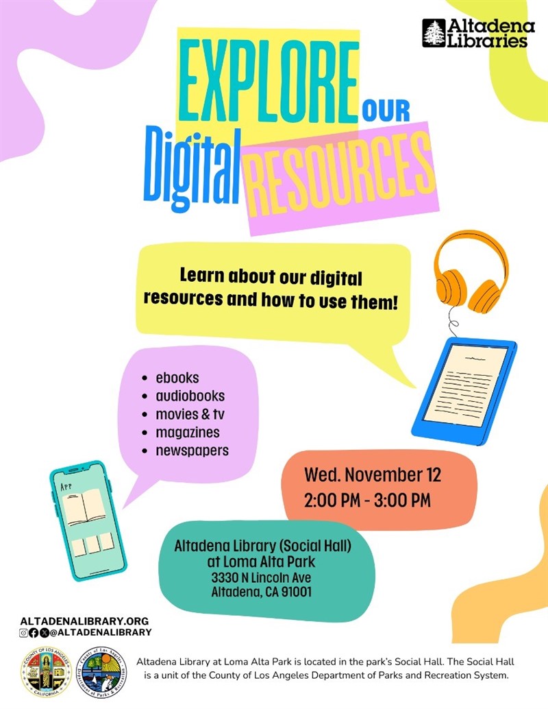 Early Literacy Play at Loma Alta!, Tuesday, Nov. 18, 10:30-11:15 a.m., Altadena Library at Loma Alta Park