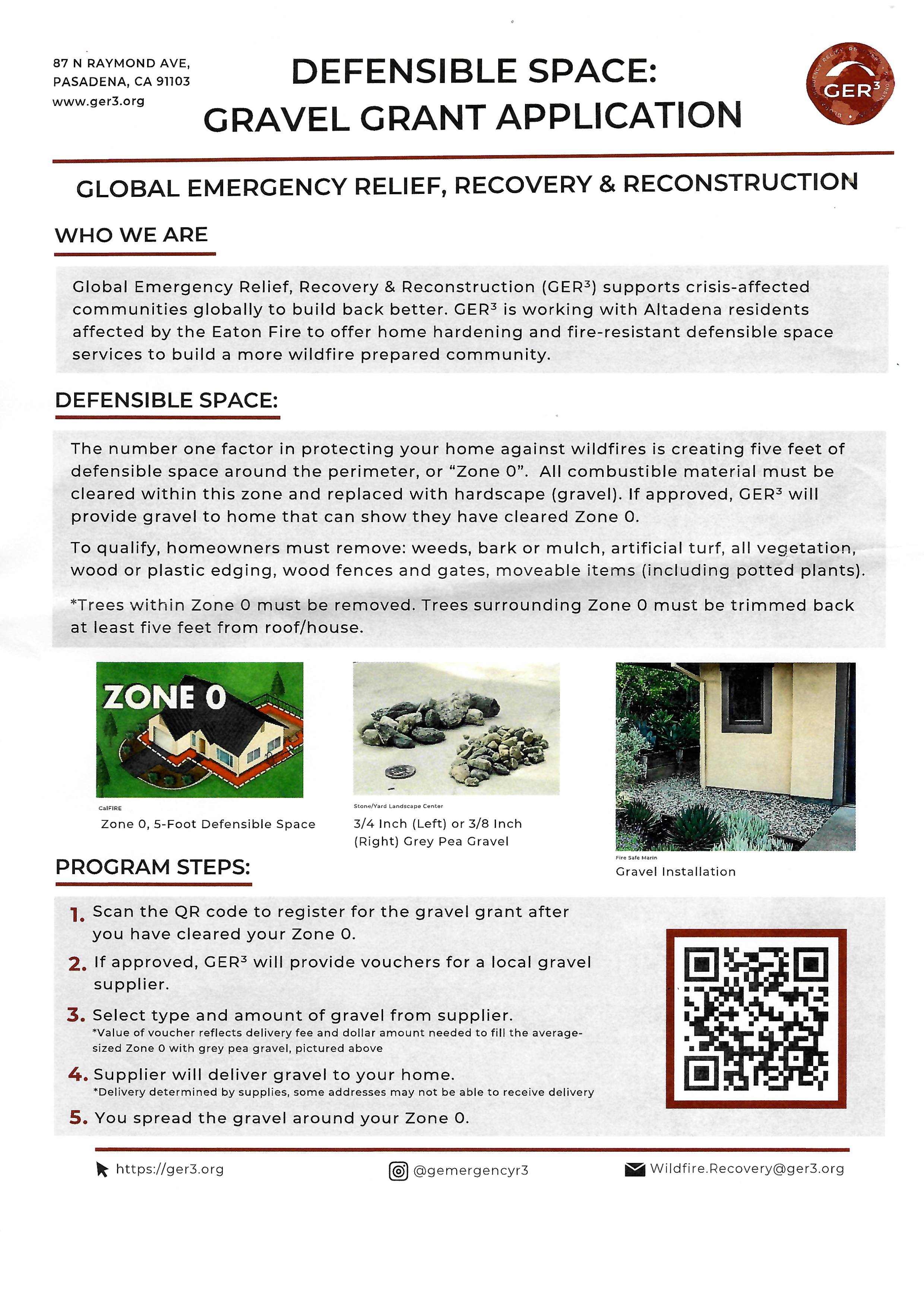 Global Emergency Relief, Recovery & Reconstruction (GER³) is offering gravel vouchers to eligible residents of Altadena to aid in the creation of defensible space around their home. The number one factor in protecting your home against wildfire is creating five feet of defensible space around the perimeter, or "Zone 0". All combustible material must be cleared within this zone and replaced with hardscape (gravel). If approved, GER3 will provide gravel to homeowners who can show they have cleared Zone 0. To qualify, homeowners must remove: weeds, bark or mulch, artificial turf, all vegetation, wood or plastic edging, wood fences and gates, moveable items (including potted plants). *Trees within Zone 0 must be removed. Trees surrounding Zone 0 must be trimmed back at least five feet from roof/house.
