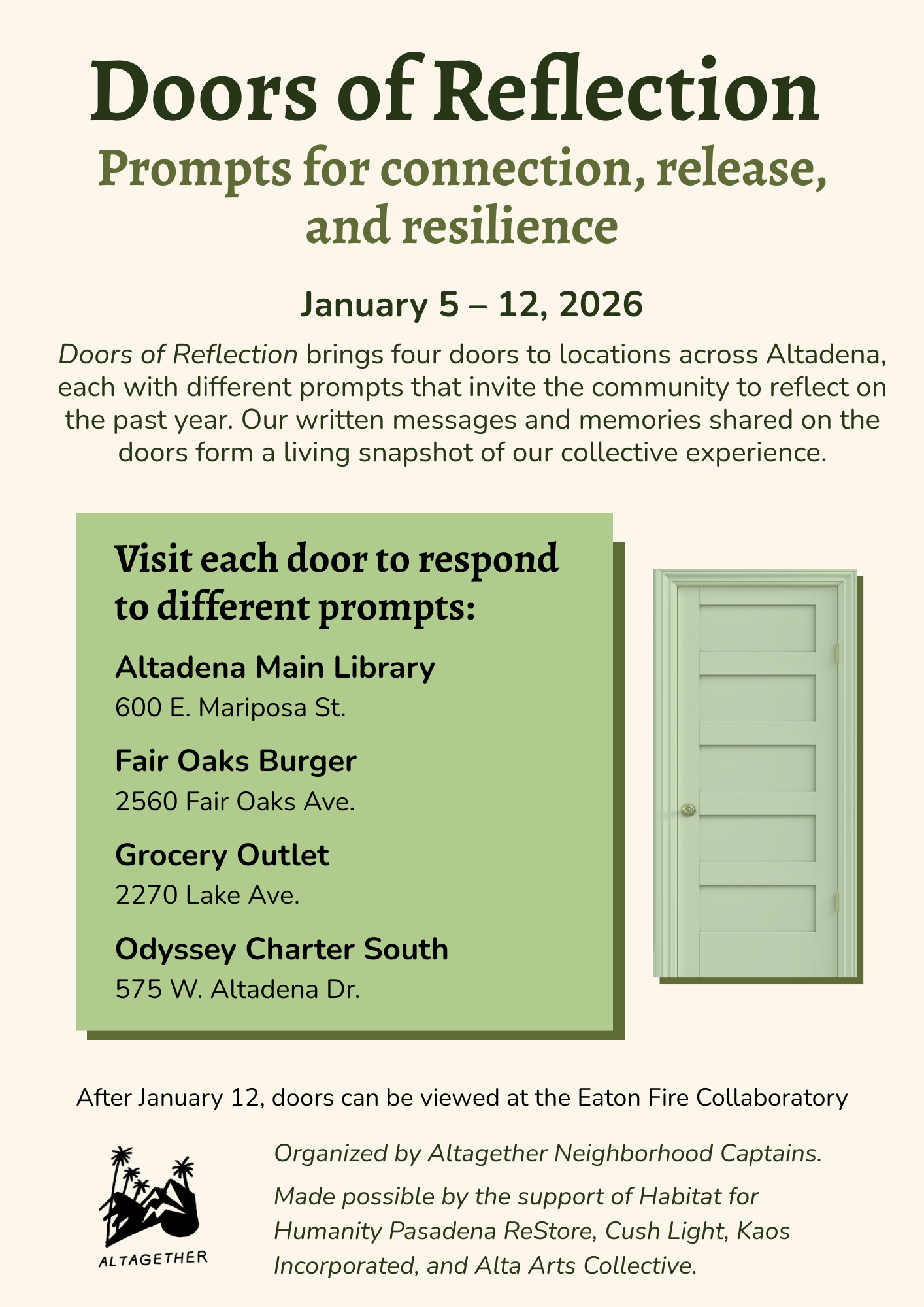 Join us at this event for the one-year anniversary of the Eaton Canyon Fire. You’ll see poets, writers, and community members reflect on memory, healing, and rebuilding. Through storytelling, photos, video, poetry, and shared reflection, the event creates space for collective mourning, connection, and the quiet hope that glows even in the darkest seasons—symbolized by the winter starlight that has long illuminated Altadena’s foothills. The evening underscores the vital role of arts and literature in healing and cultivating belonging. Participants: • Nahshon Dion, Writer • Florence Annang, Founder, THRIVE Learning Lab • Hans Allhoff, Chair, Altadena Heritage • Michele Zack, Historian & Writer • Pablo Miralles, Filmmaker • Heather Morrow, Artist • Brandon Lamar, President, Pasadena NAACP • Patricia Cunliffe, Filmmaker • LZ Love, Singer & Songwriter • Erica Slater, Altadena Community Garden • Sunny Mills, Photographer • Sam James, CEO & Co-Founder, Altadena Recovery Team (ART) • Kristen Ochoa, Founder, Chaney Trail Corridor Project