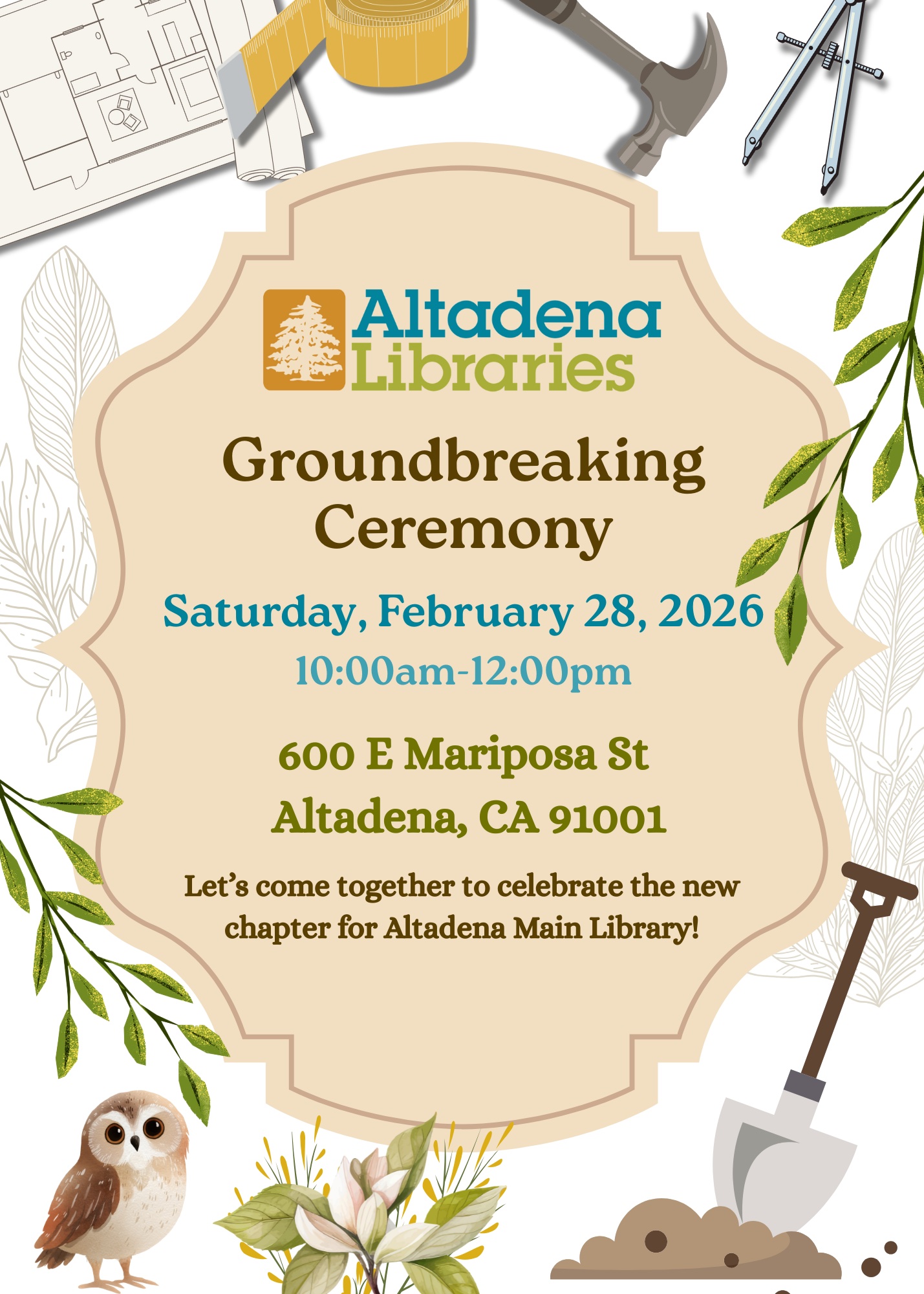 The Altadena Library’s current Poets Laureate are seeking applicants for Poets Laureate for the 2026-2028 term. The Altadena Poets Laureate play an important role in promoting poetry in Altadena through curating public poetry readings and workshops at the Altadena Libraries and serving as editor for the publication of the virtual and printed Altadena Literary Review Anthology. The Altadena Poets Laureate are volunteers who are officially appointed by the Board of Trustees of the Altadena Library District, which provides an annual operating budget for Laureate programming. To apply, please submit the following application and attachments (in Word or PDF format) via email to altadenapoetryreview@gmail.com by February 15, 2026. Any applications received after the due date will not be considered. Applicants are encouraged to thoroughly review the Altadena Poet Laureate Volunteer Services Agreement on the Altadena Library District website to gain a full understanding of the responsibilities and expectations for this volunteer role. How to Apply Please submit the following documents in one email: