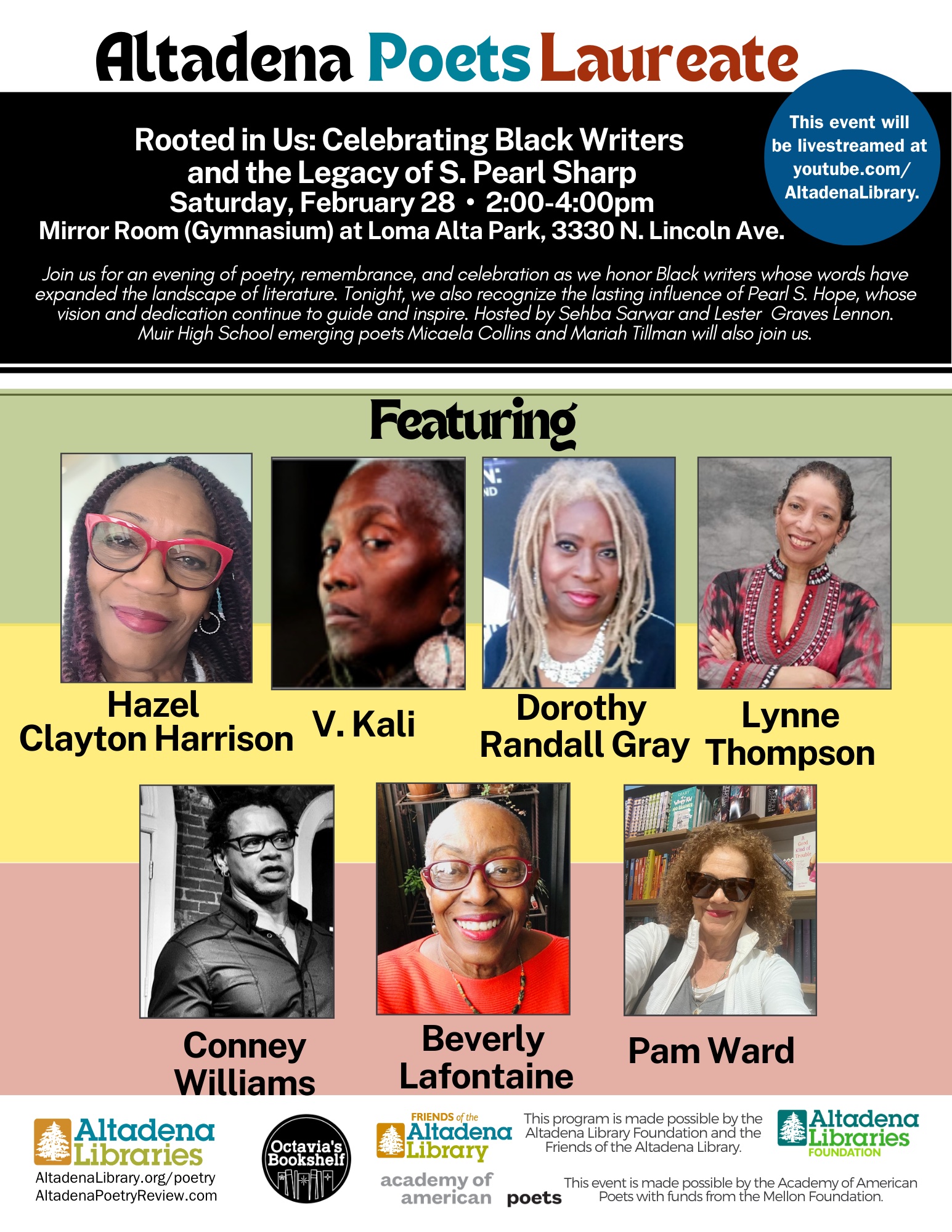 Featuring Hazel Clayton Harrison, V. Kali, Dorothy Randall Gray, Lynne Thompson, Conney Williams, Beverly Lafontaine, Pam Ward, Muir High School emerging poets Micaela Collins and Mariah Tillman + Open Mic Join us for an afternoon of poetry, remembrance, and celebration as we honor Black writers whose words have expanded the landscape of literature. Tonight, we also recognize the lasting influence of Pearl S. Hope, whose vision and dedication continue to guide and inspire. Hosted by Sehba Sarwar and Lester Graves Lennon. This event will be livestreamed at youtube.com/ AltadenaLibrary. Supported by Friends of the Altadena Library, the Altadena Library Foundation, Octavia's Bookshelf, and Academy of American Poets.