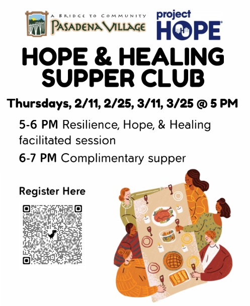 Pasadena Village & Project Hope: Hope & Healing Supper Club Wednesdays, 2/25 , 3/11, 3/25 • 5:00 PM Pasadena Village, 236 W Mountain St, #113, Pasadena, CA 91103