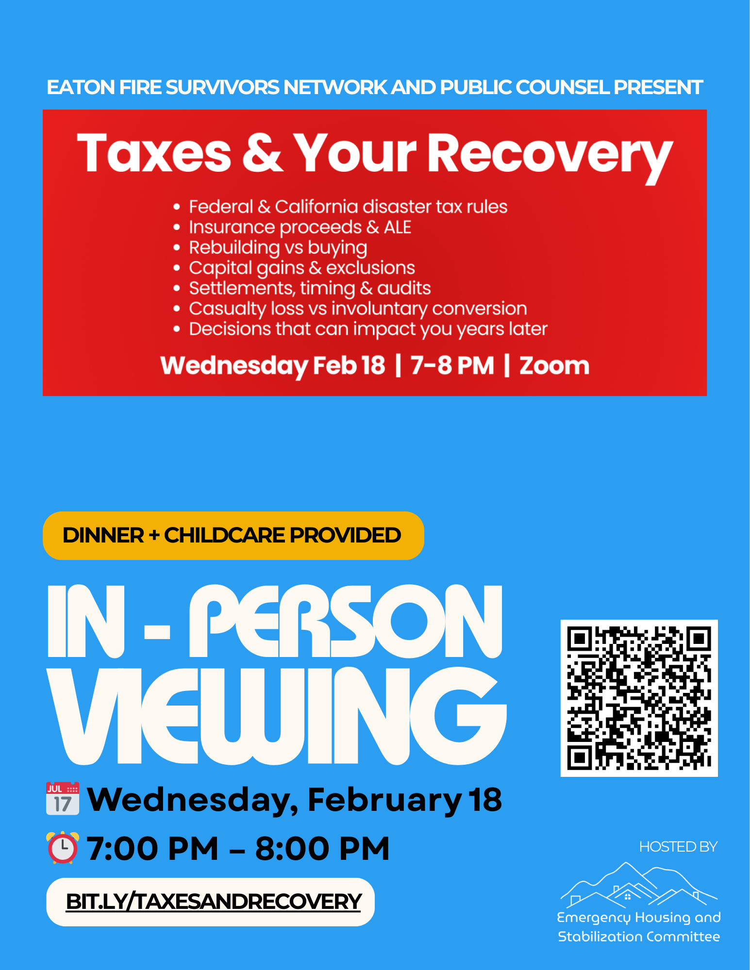 Join the Eaton Fire Survivors Network and Public Counsel, for a one-hour educational webinar focused on helping survivors understand what must be reported, what may be excluded, and how to avoid unintended tax consequences.