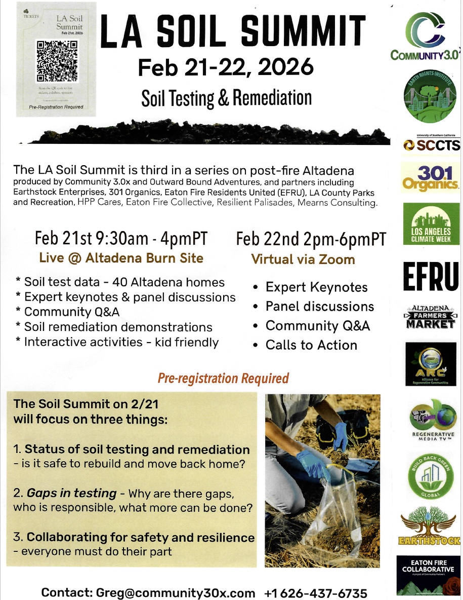 Join us online for an extended exploration of wildfire soil recovery—diving into the technical details, examining case studies from other fire-affected regions, and developing actionable strategies for community-scale remediation. This session welcomes anyone invested in environmental recovery: soil scientists, public health professionals, environmental justice advocates, municipal leaders, and community members ready to turn knowledge into neighborhood action.