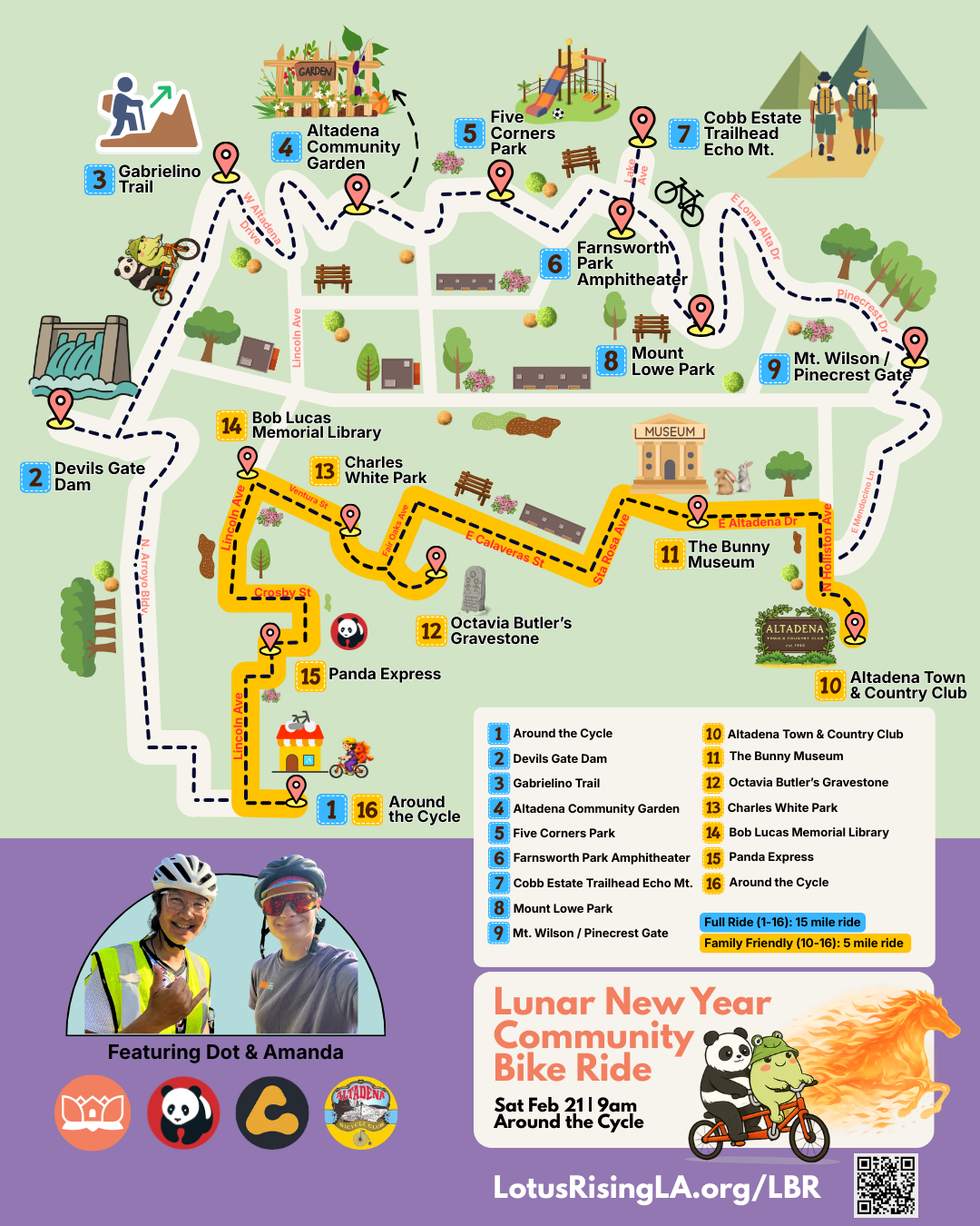 Join us for our second annual community bike ride through Pasadena and Altadena, led by Altadena Councilwoman, Dot Wong, and Lotus Word Nerd, Amanda Walgrove. Riders can choose between a 15-mile full ride or a 5-mile shorter, family friendly option.