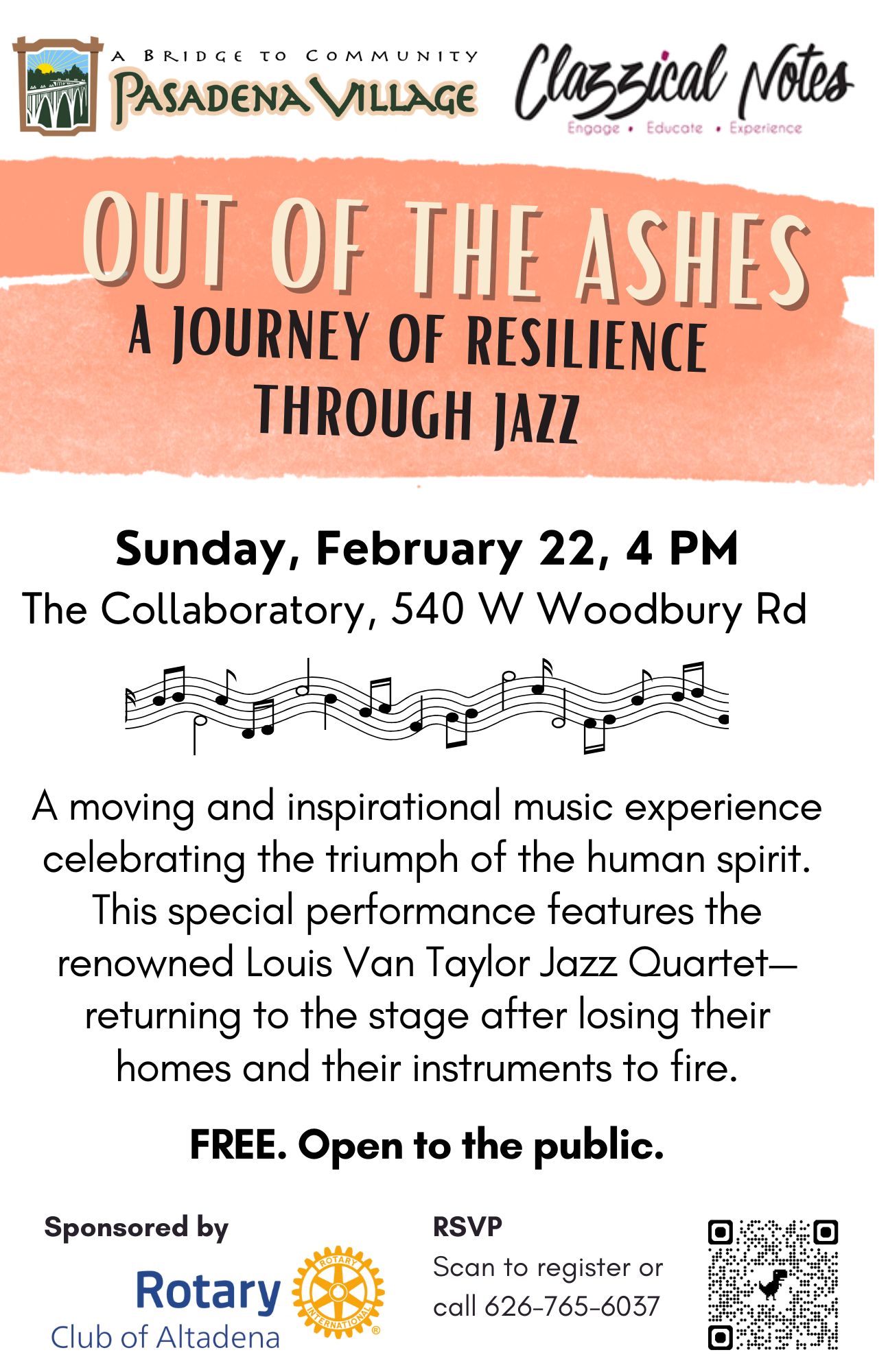Out of the Ashes is a moving and inspirational music program that celebrates the triumph of the human spirit over adversity. Presented by Clazzical Notes in a heartfelt partnership with Pasadena Village, this performance features the renowned Louis Van Taylor Jazz Quartet. Request a free ride when you register for this, or any Pasadena Village or recovery-related event, or email pablo@pasadenavillage.org and we will arrange an assisted or non-assisted ride at no cost to you.